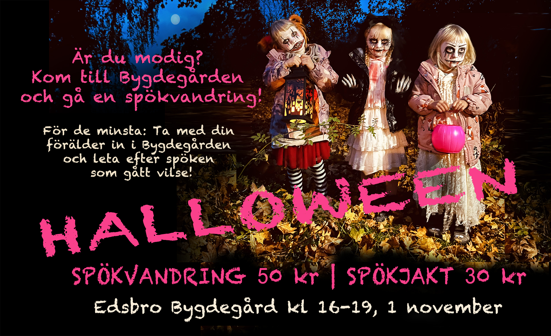 Fira Halloween med Edsbro Bygdegård, lördag 1 november, kl 16-19. Gå på läskig spökvandring efter mörkrets inbrott! För de mindre barnen: Ta med din förälder in i Bygdegården och leta efter spöken som gått vilse! Fika och pyssel inomhus.